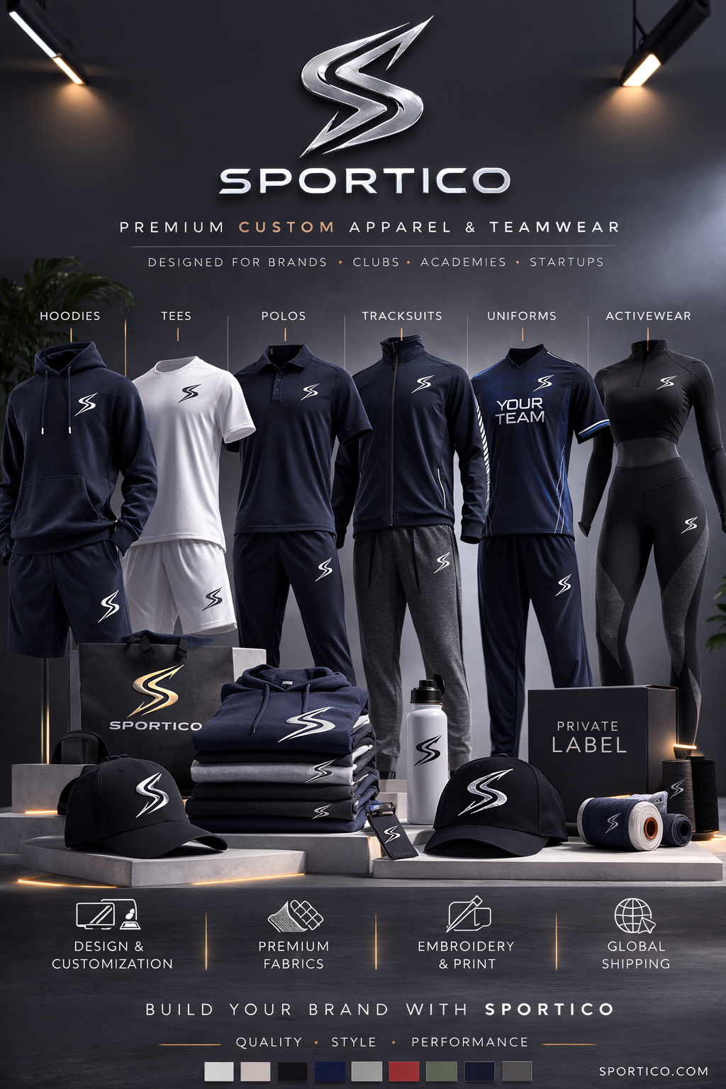 Sportico is a B2B custom apparel manufacturing brand focused on premium sportswear, gym wear, uniforms, hoodies, T-shirts, polos, tracksuits, and complete customization solutions. We work with clothing brands, startups, fitness labels, sports teams, schools, corporate clients, and global buyers looking for a reliable manufacturing and branding partner.